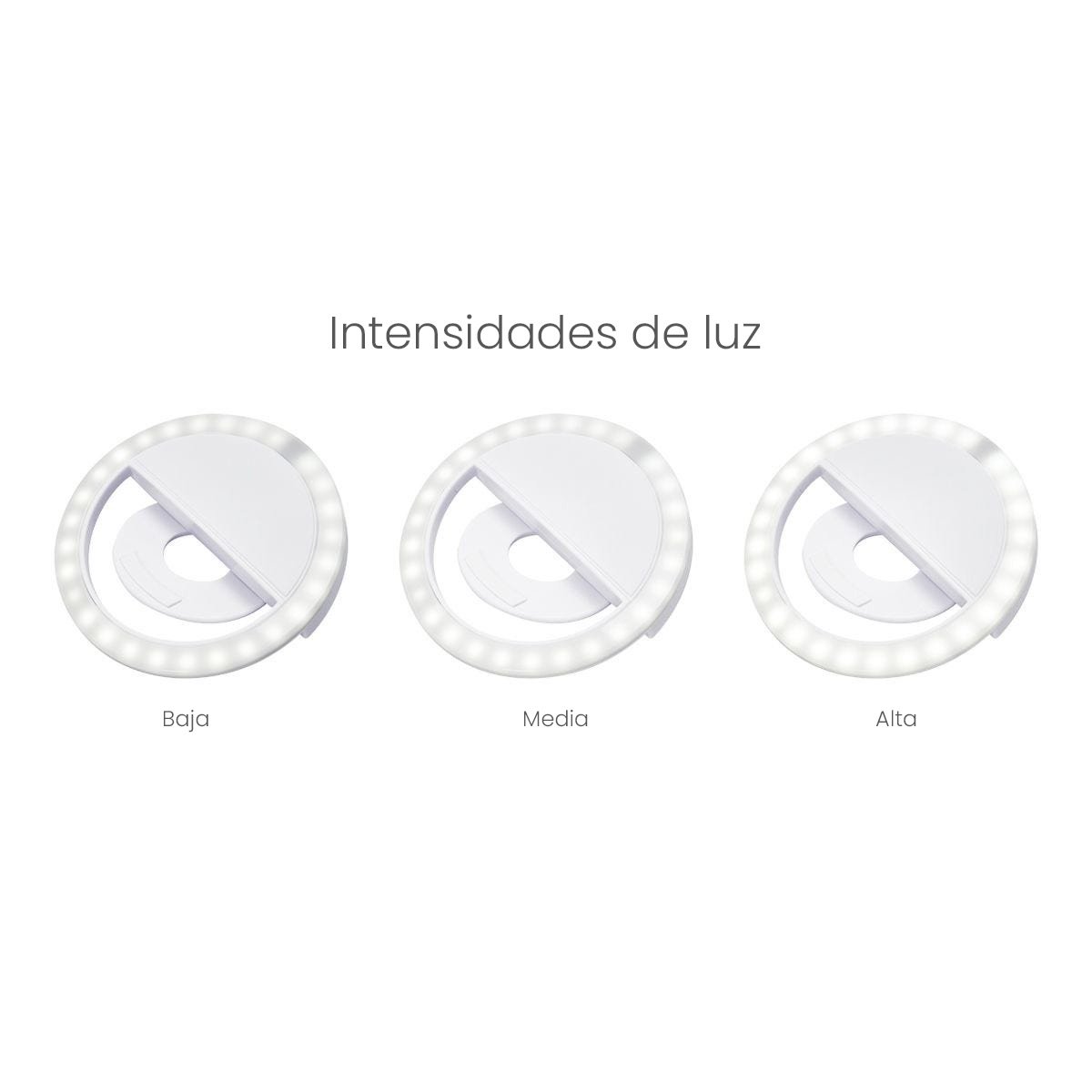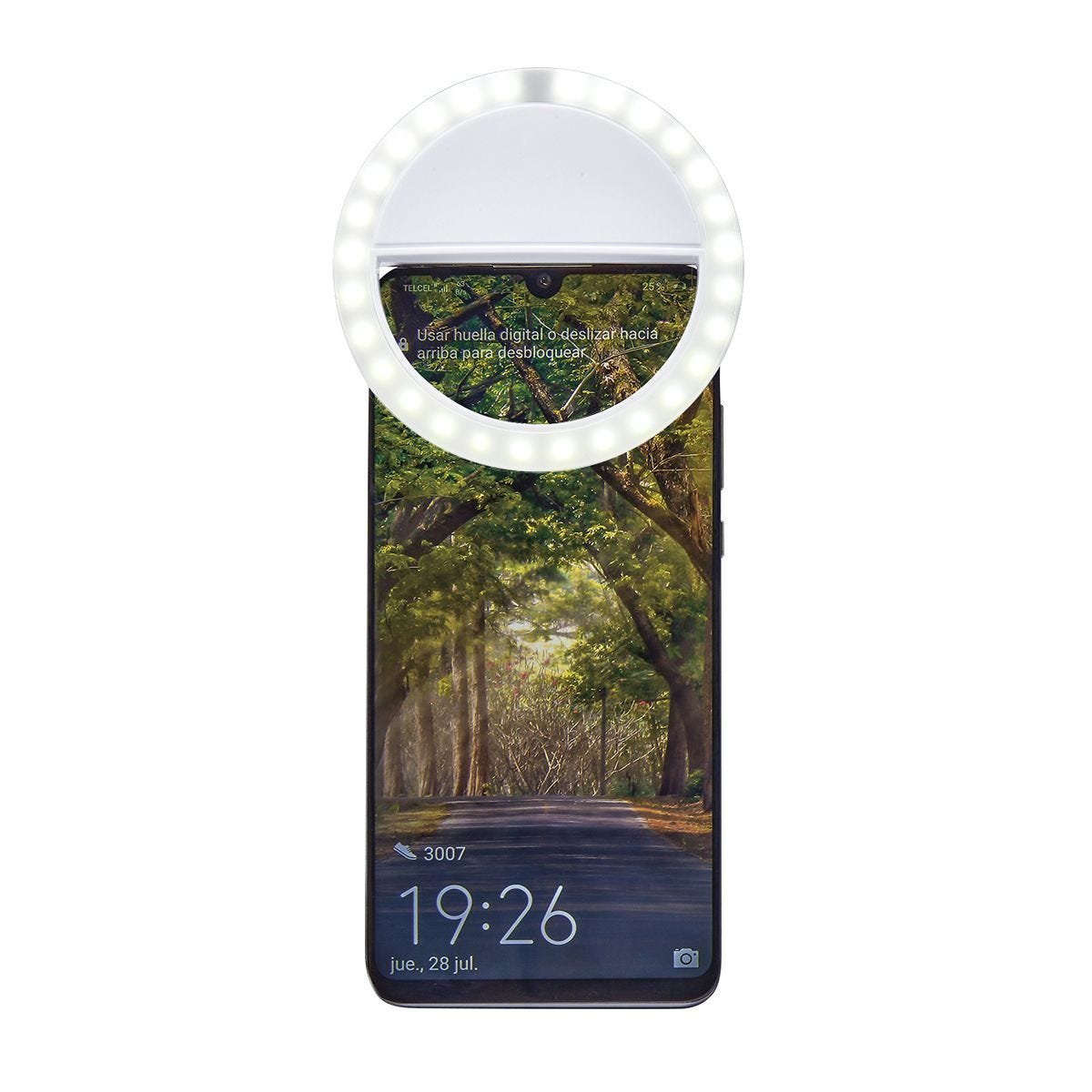 Aro de luz de 28 LEDs con clip ajustable. Se puede montar en smartphones o computadoras para mejorar las fotografías, videos o videollamadas. Cuenta con 3 diferentes intensidades de luz. Incluye batería recargable y cable auxiliar micro USB.