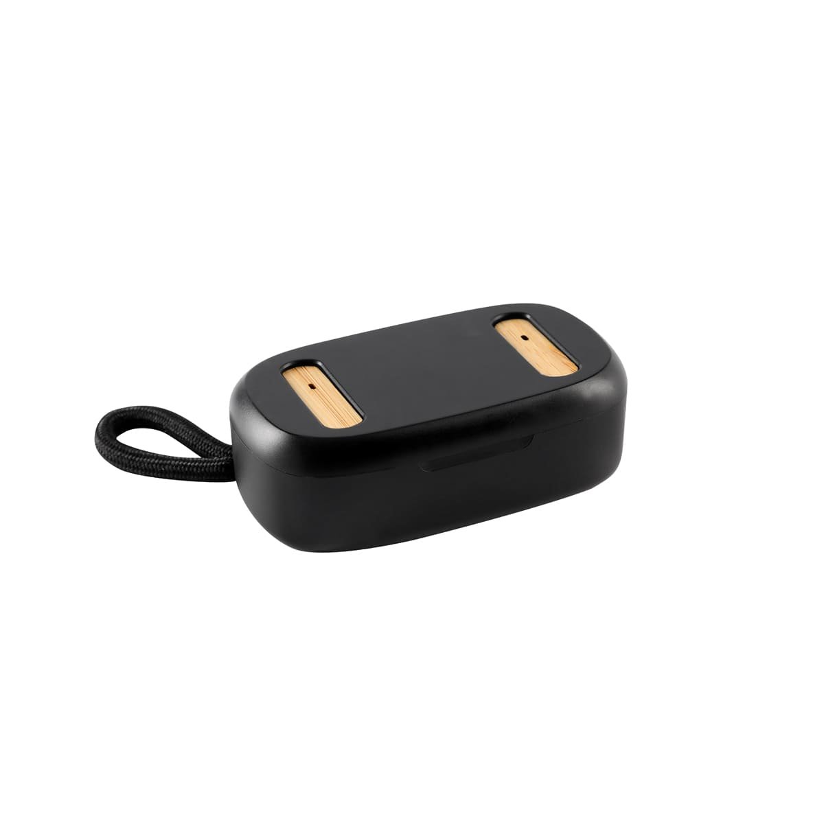 Audífonos bluetooth con base recargable. Sus materiales reciclados lo hacen amigable con el medio ambiente. Controles touch integrados para reproducción de música y función de llamada. Reproducción de música 4 horas aproximadamente. Rango de conexión de 10 metros. Tiempo de carga 1.5 horas. Batería de 40mAh (audífonos) y 400mAh (estuche). Incluye estuche de carga con asa de poliéster y cable con puerto tipo C.