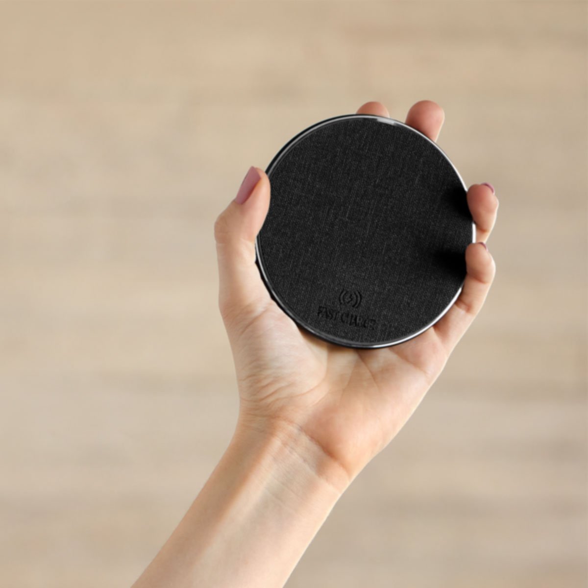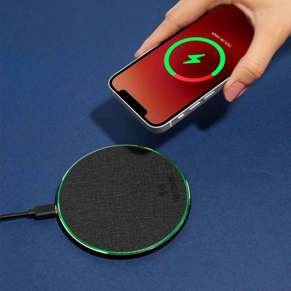 Cargador inalámbrico “fast charge”. Velocidad de carga: 5W / 7.5W / 10W / 15W. Se enciende luz color verde cuando está en reposo y luz color azul cuando está en proceso de carga. Incluye cable auxiliar tipo C y caja individual.