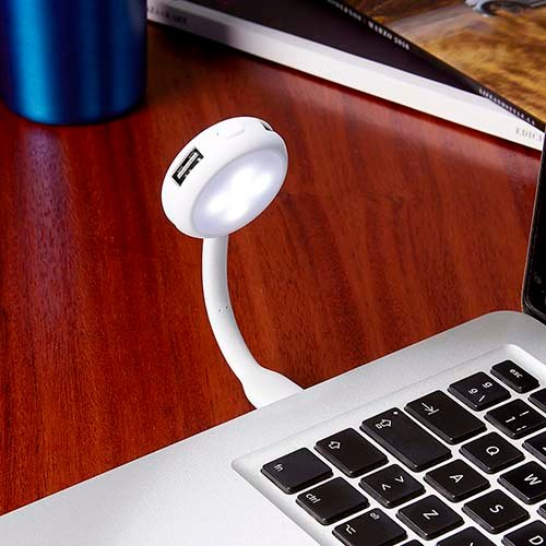 Concentrador con 4 puertos USB 2.0 y luz LED. Incluye botón para encender y apagar la lámpara. Cuerpo flexible. No requiere baterías.
