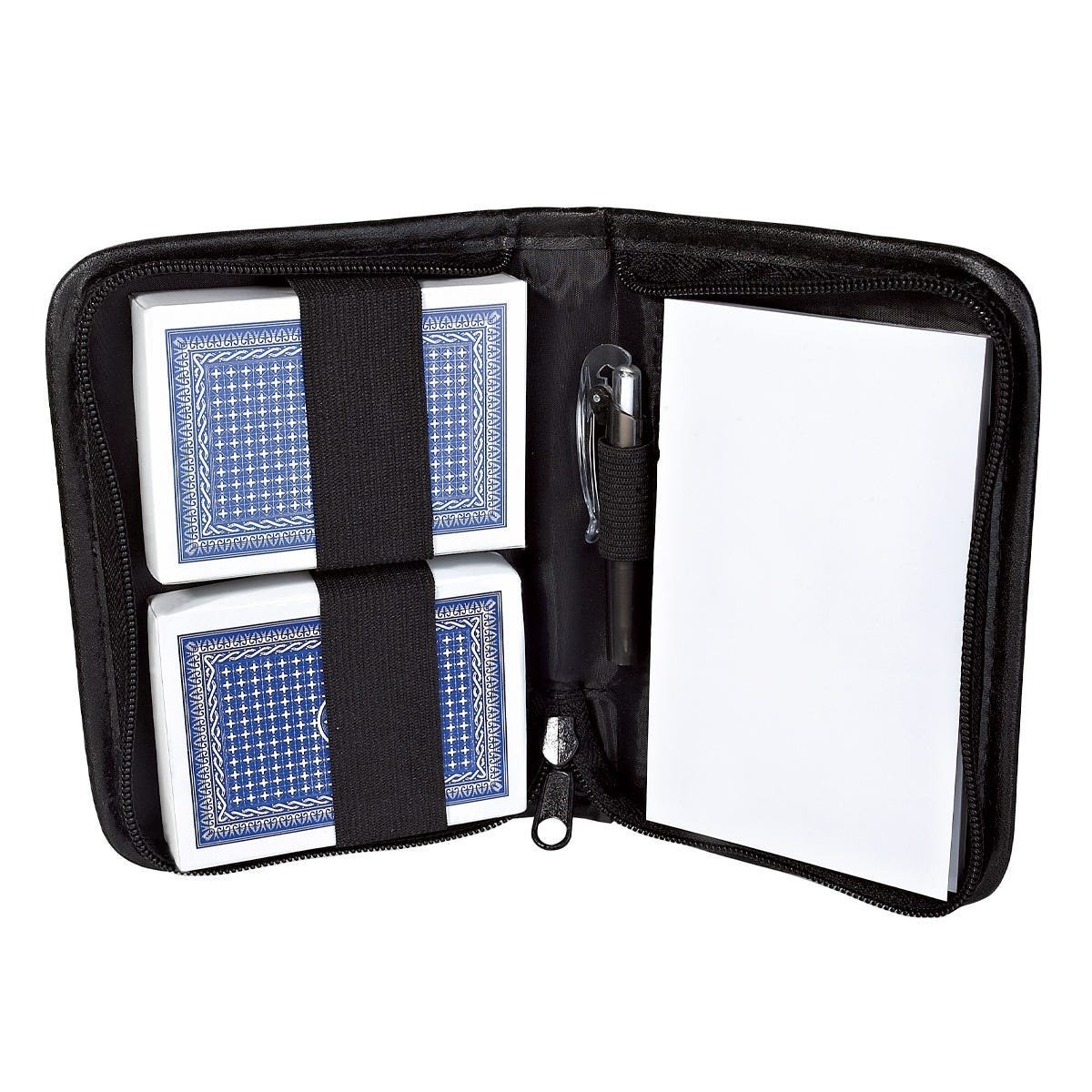 Estuche de curpiel con 2 barajas de cartón, libreta y bolígrafo.