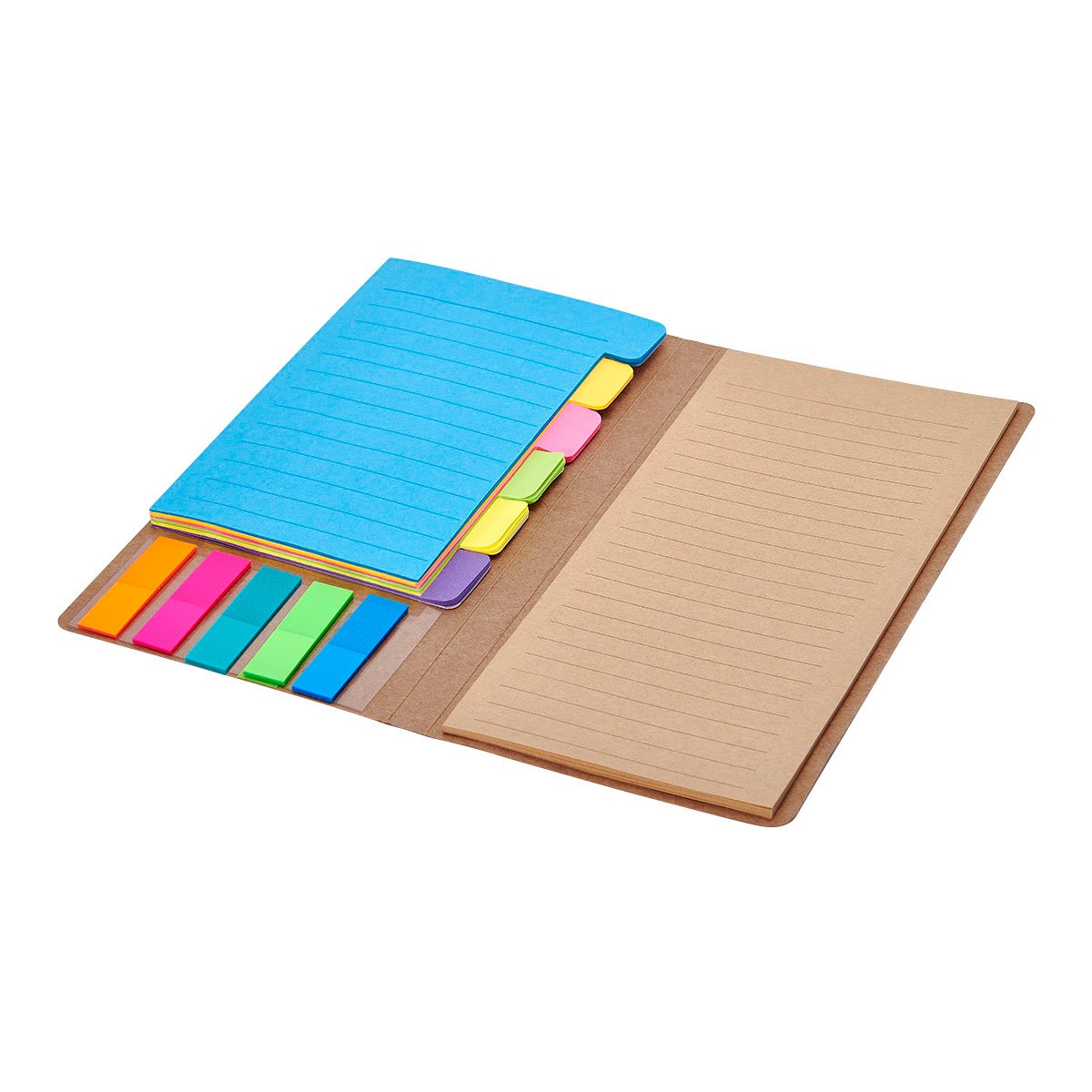 Incluye notas adhesivas a rayas en 6 colores diferentes con 10 hojas cada una, banderines adhesivos en 5 colores con 25 notas cada uno, 20 hojas a raya.