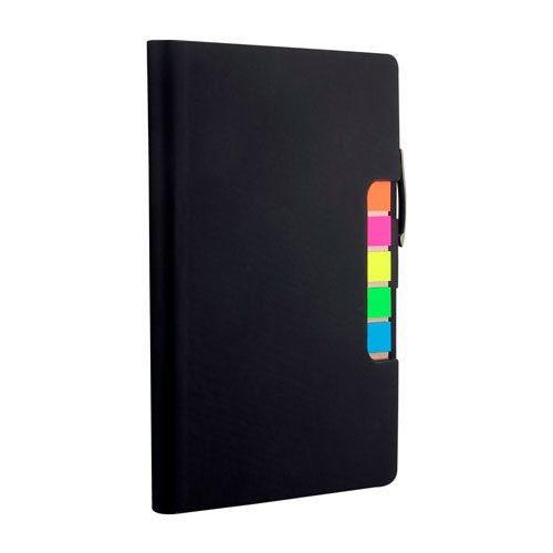 Libreta con 70 hojas de raya. Incluye bolígrafo y notas adheribles de colores.