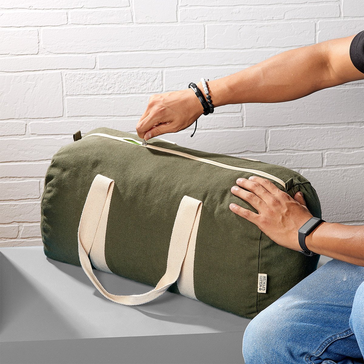 Maleta ecológica fabricada con algodón reciclado. Cuenta con un compartimento principal con cierre y dos asas para hombro.