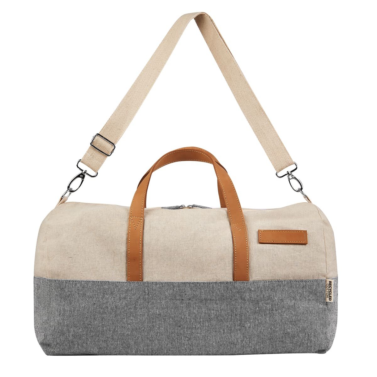 Maleta que destaca tanto en diseño como en estilo. Es ligera y ecológica, hecha de algodón reciclado. Compartimento principal con cierre y base de cartón removible. Incluye asa ajustable removible para hombro.