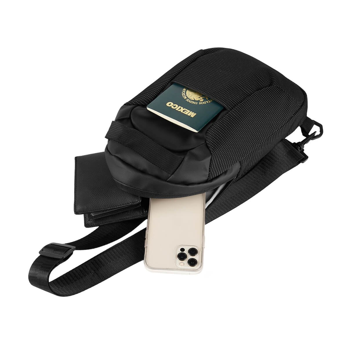 Mochila de viaje tipo crossbody con diseño versátil y compacto. Confeccionada en poliéster de dos texturas: una suave al tacto y otra con diseño punteado. Cuenta con bolsillo frontal de acceso rápido, compartimento principal con cierre, asa de mano y respaldo acolchado. Su correa ajustable con broche de doble posición permite usarla al hombro derecho o izquierdo.