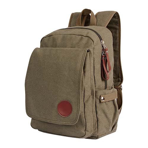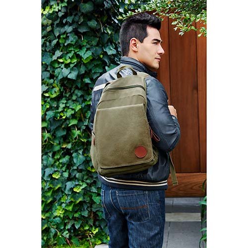 Bolsa principal con cierre y bolsa frontal de solapa con broche. Dos bolsas laterales con broche. Espacio para laptop de 14″. Tirantes ajustables y asa de agarre superior.