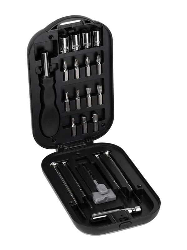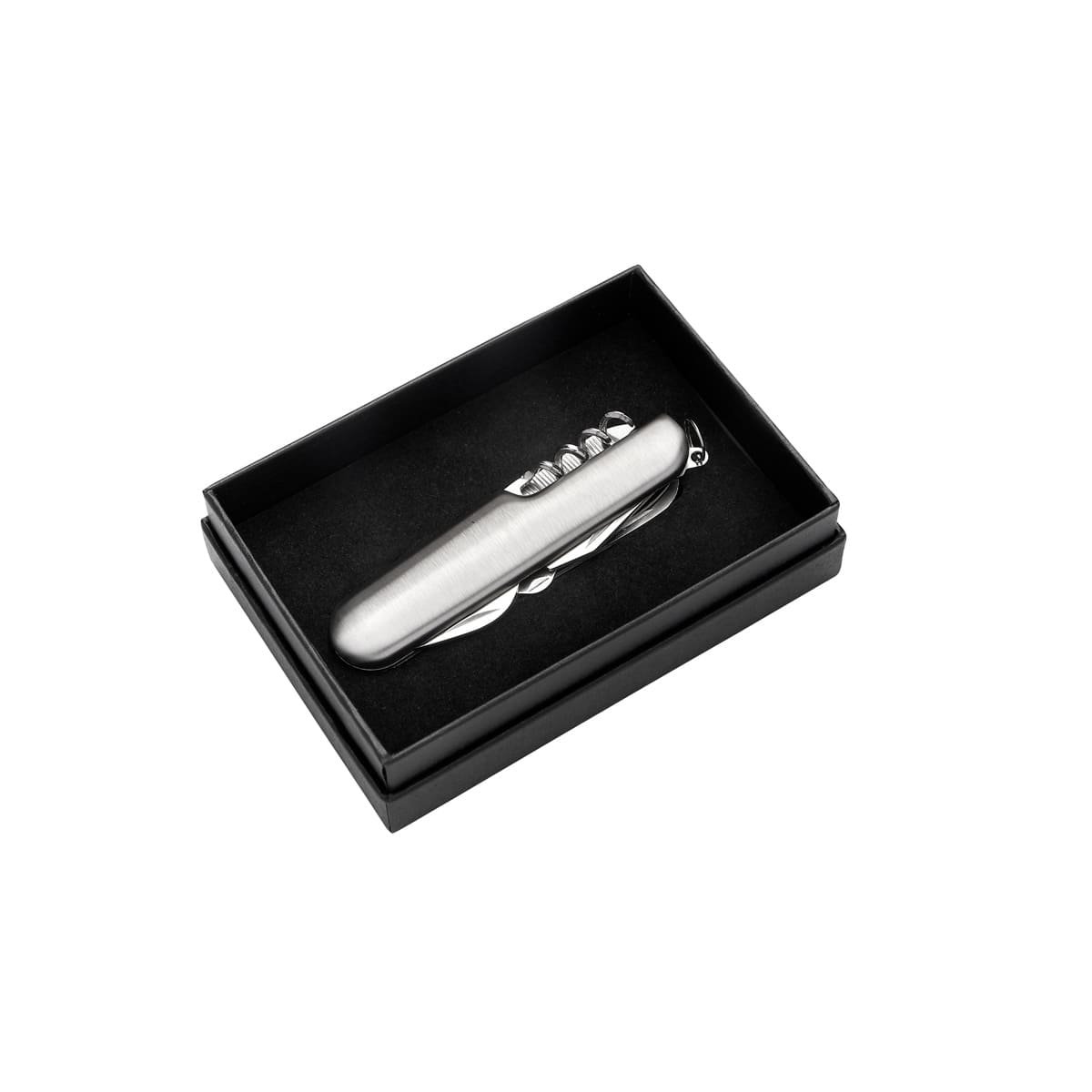 Navaja metálica compacta y resistente. Incluye 9 funciones: Tijeras, navaja, sierra para madera, abrelatas, destornillador plano y de cruz, destapador, lima, punzón plano, sacacorchos y aro para llavero. Combina versatilidad y durabilidad, diseñada para superar cualquier desafío. Incluye caja individual.