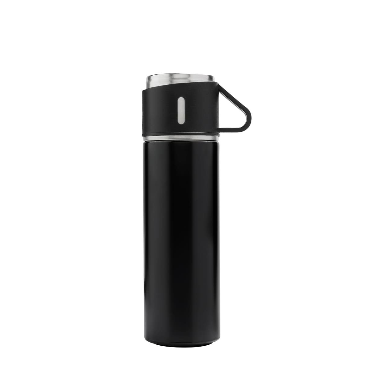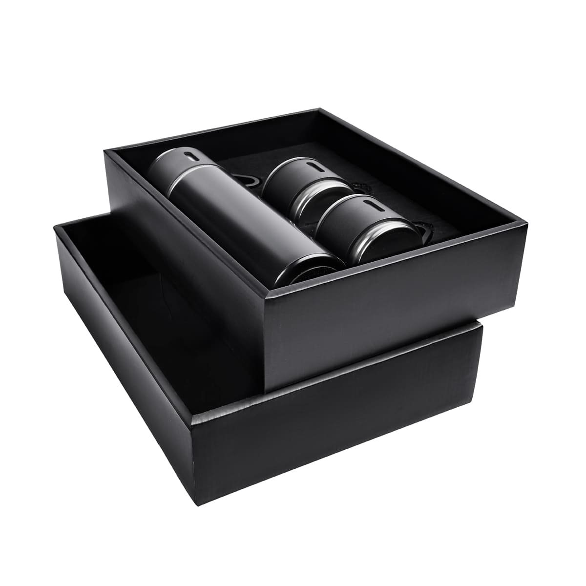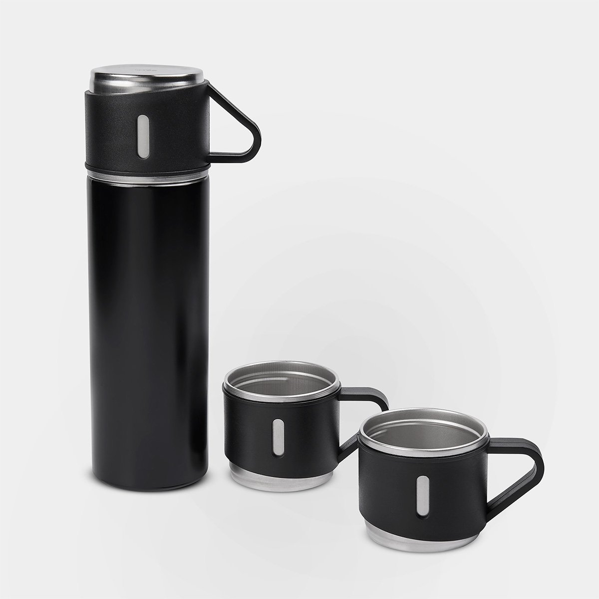Set de regalo con 1 termo cuya tapa sirve como taza y 2 tazas adicionales. Termo doble pared cerrado al vacío, pared interna y externa de acero inoxidable, tapa interna de rosca con sistema push para verter fácilmente sin retirar el tapón, mantiene temperatura caliente 6 hrs y temperatura fría 8 hrs. Las tazas de acero inoxidable con un recubrimiento y asa de plástico. Incluye Caja de regalo.