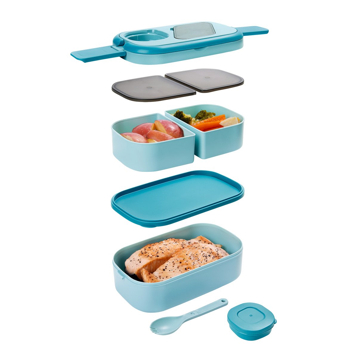 Set de lonchera y portaviandas. Incluye contenedor de alimentos con triple compartimento, capacidad total de 1.6 litros. Su tapa cuenta con asas plegables que facilitan su transporte, además, una práctica cuchara tenedor y un mini recipiente para aderezos. Su lonchera es el complemento perfecto, fabricada en poliéster con interior de aluminio. El compartimento principal, cuenta con un cierre seguro y un bolsillo interior de malla, para guardar objetos pequeños. Apto para microondas o lavavajillas. Capacidad para 6 latas.