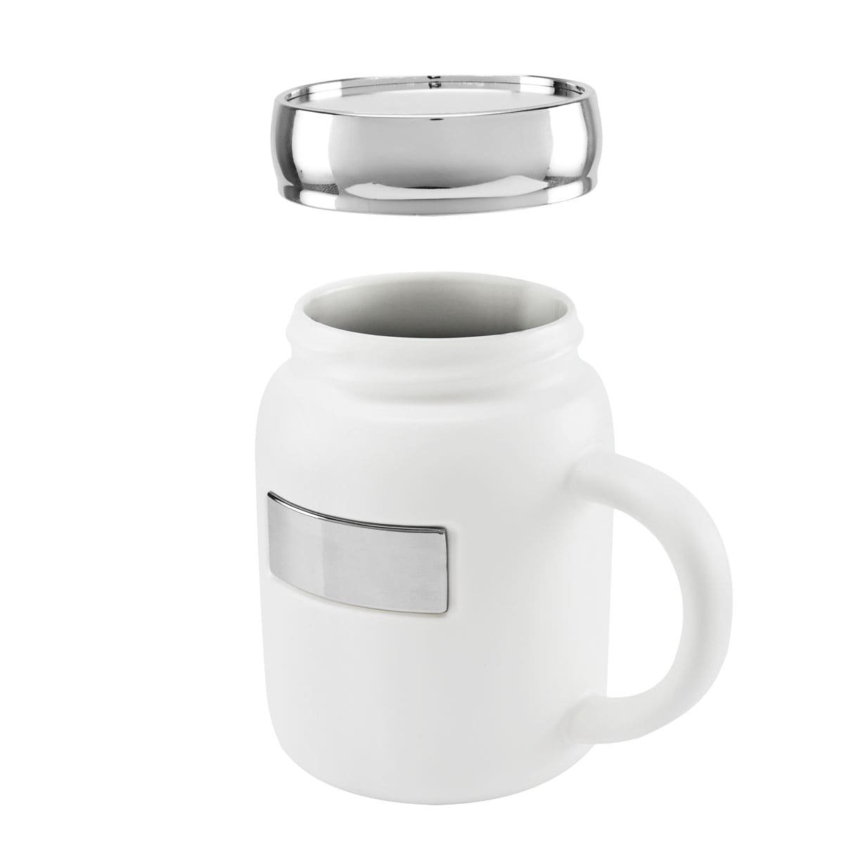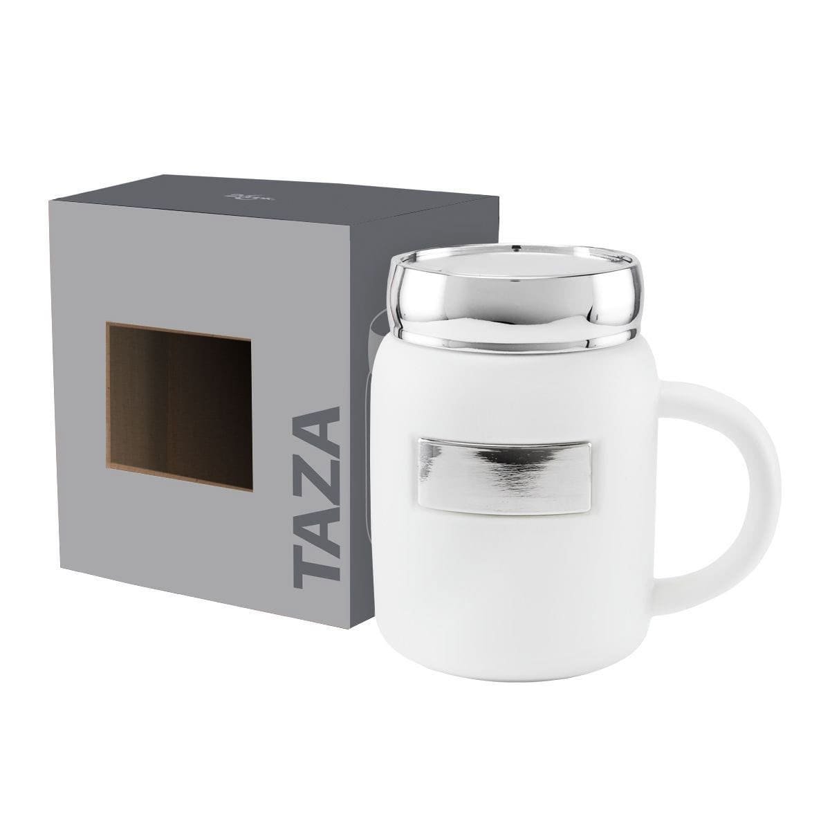 Taza tarro de cerámica con placa metálica para impresión. Tapa de rosca de plástico con recubrimiento metalizado. Terminado mate. Incluye caja individual.