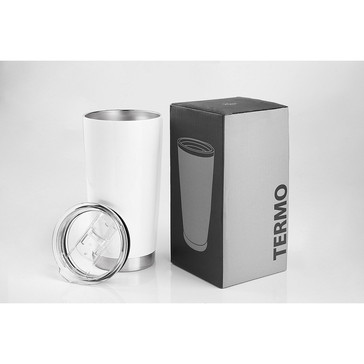 Termo para sublimar doble pared. Cerrado al vacío. Pared interna y externa de acero inoxidable. Tapa de plástico con válvula de seguridad. Mantiene temperatura caliente 6 hrs y temperatura fría 8 hrs aproximadamente. Incluye caja individual.